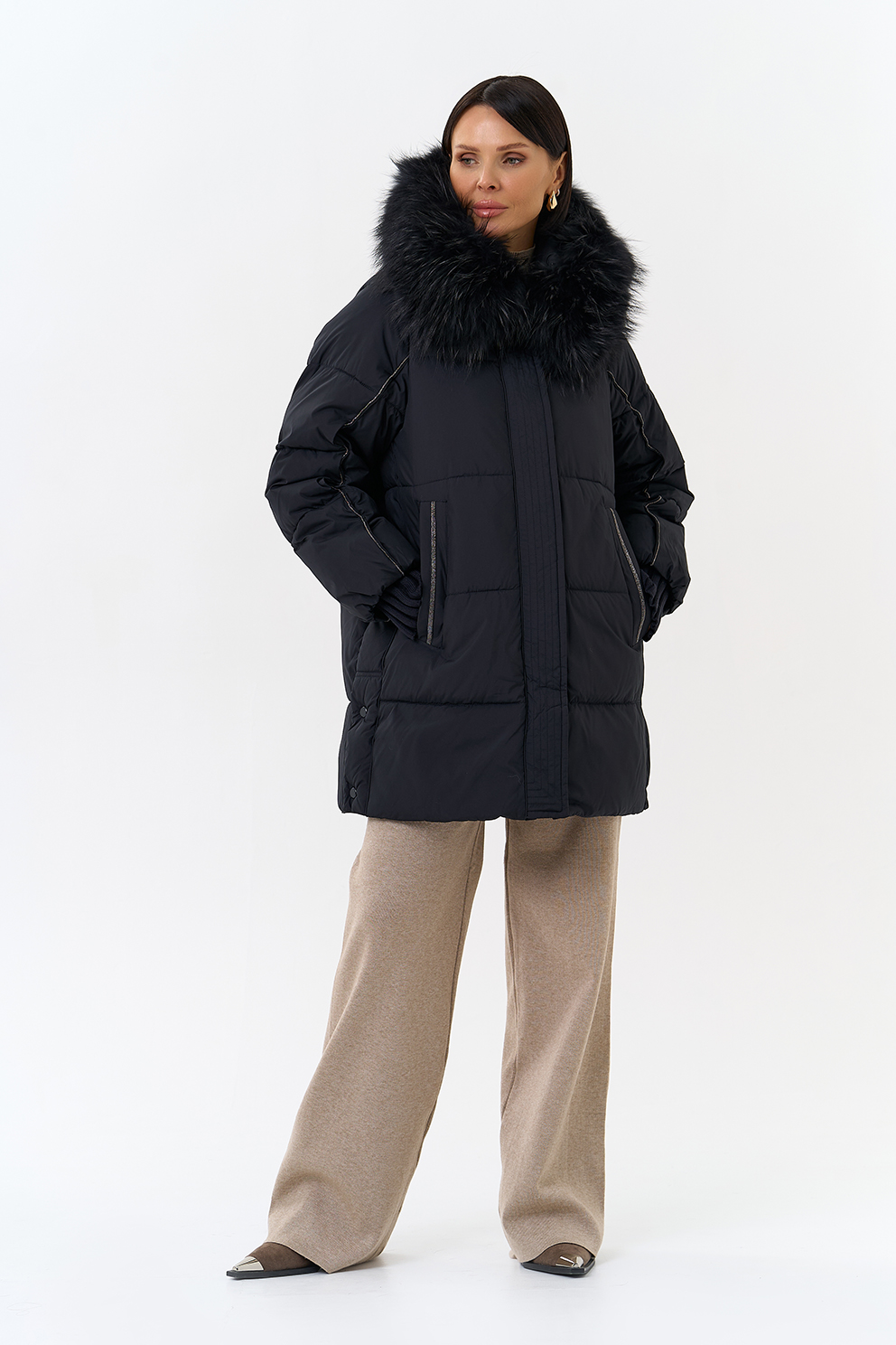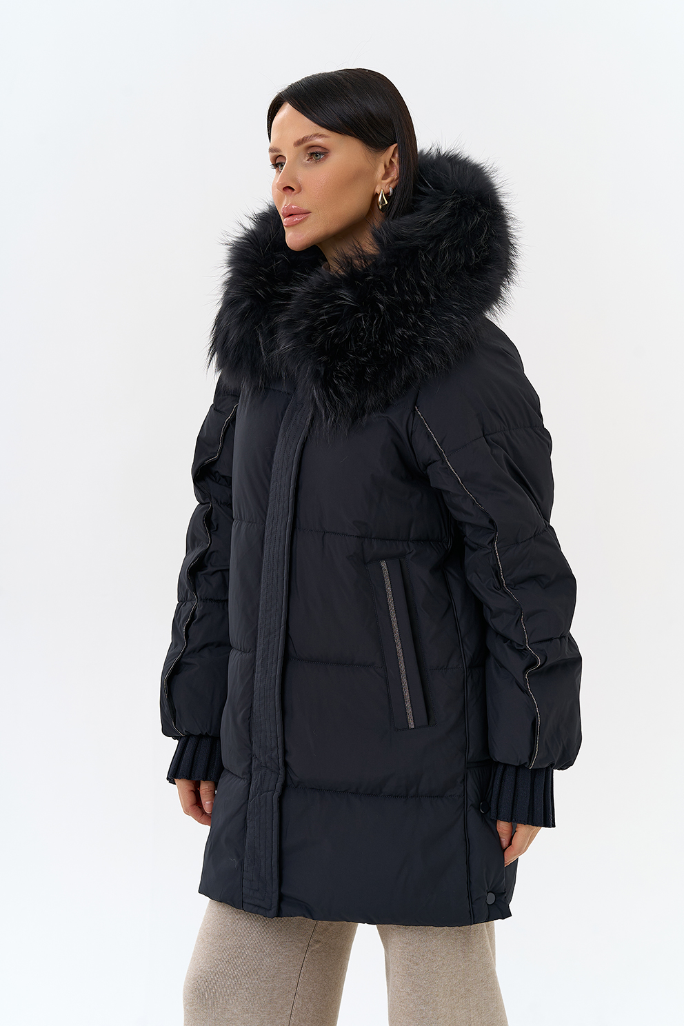 Крой воротника - капюшон, отделка енот