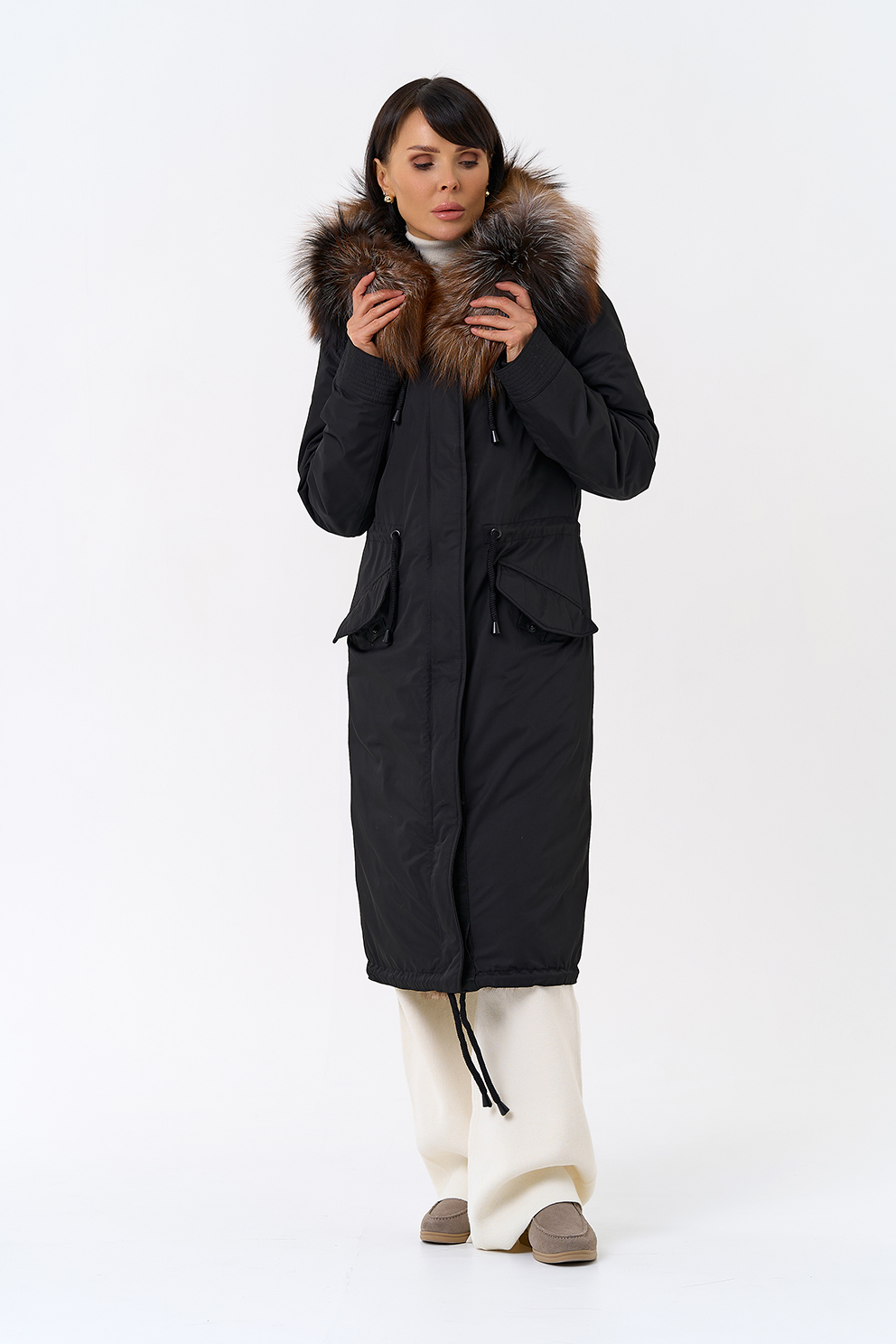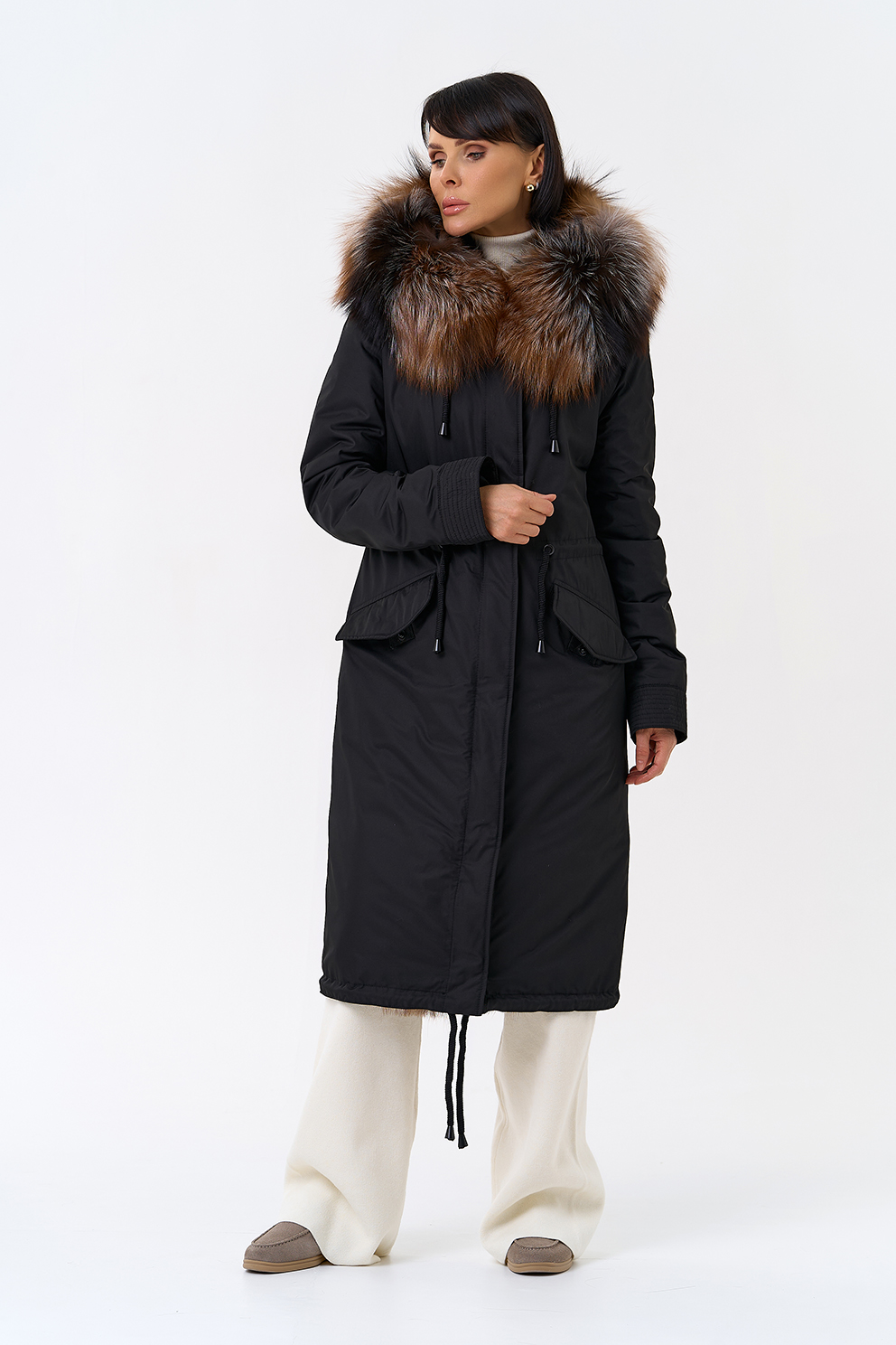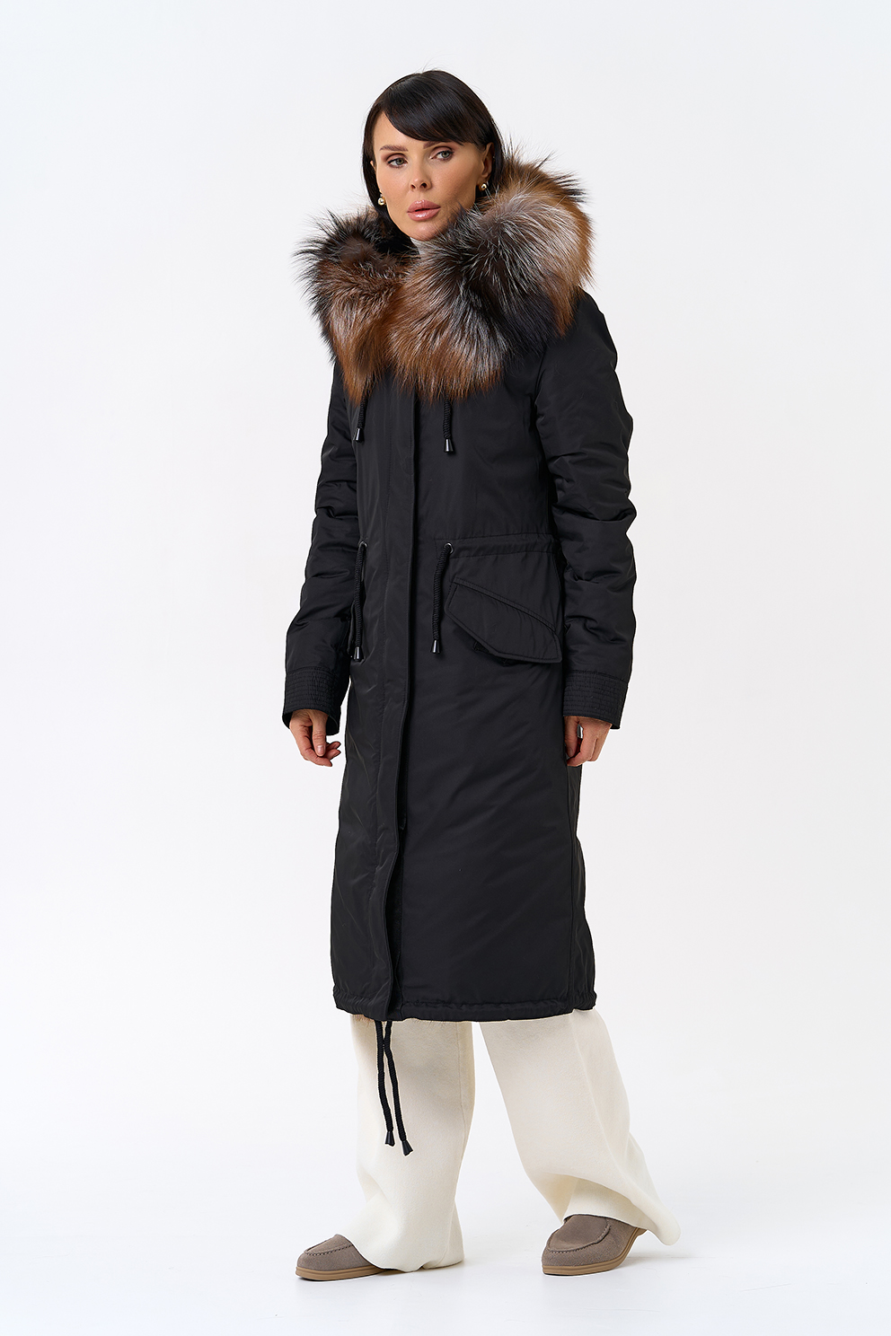 Крой воротника - капюшон, отделка чернобурая лиса Otoban, овчина