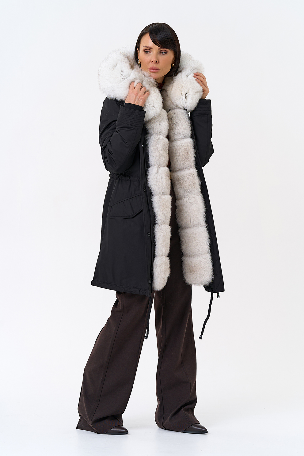 Крой воротника - капюшон, отделка песец цвет натуральный, овчина