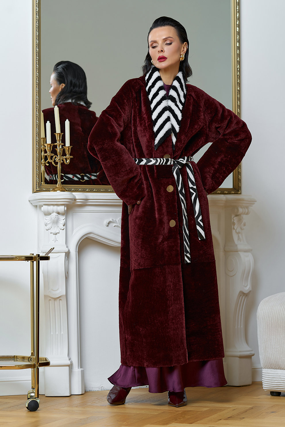 Вид застежки - кнопки, пояс из меха теленка Cavallino